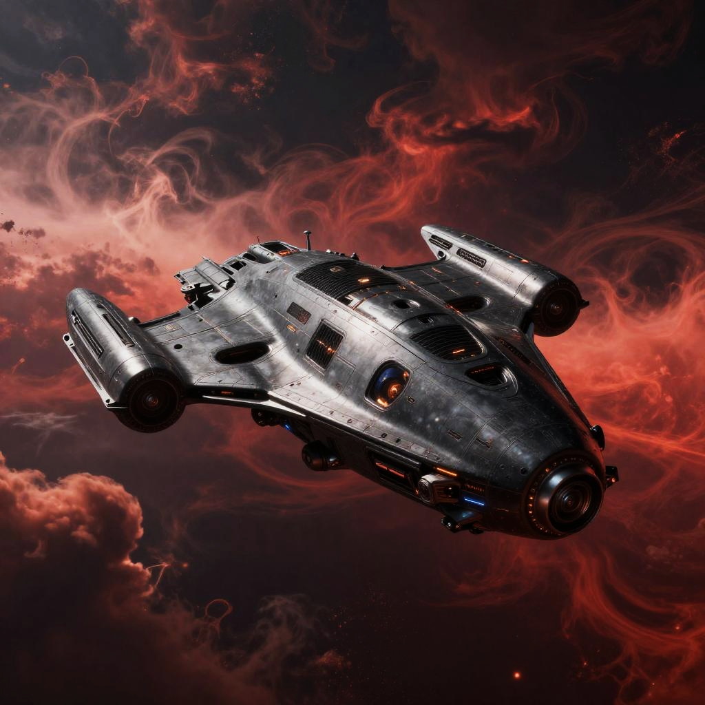 Venera Maxima Blacked, a futuristic spacecraft gliding through the dense, swirling atmosphere of Venus, dark metallic hull reflecting the planet's sulfuric clouds under a crimson sky, high-tech sci-fi art style with dramatic lighting.