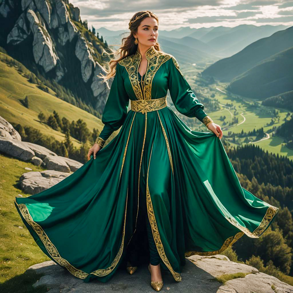 Curvy woman with braided hair wearing a flowing emerald green silk robe adorned with gold trim and intricate ornate details. The high-collared, long-sleeved medieval fantasy style dress creates a mystical aura as she poses gracefully on a rocky mountain top with dramatic shadow play and scenic mountain ranges in the background.