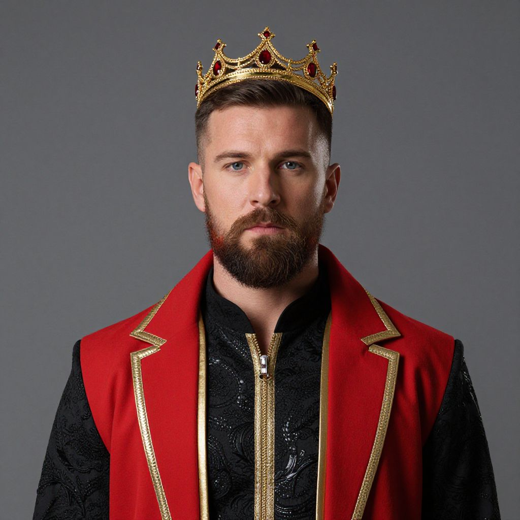 Photograph of a bearded man with fair skin and short brown hair, wearing a gold crown adorned with red gemstones. He has a serious expression and blue eyes. He is dressed in a black, intricately patterned shirt with a high collar, and a red and gold trimmed royal robe. The background is a plain, gradient gray, highlighting the man's regal appearance. The lighting is soft, emphasizing the textures of the robe and the details of the crown. The overall style is formal and majestic.