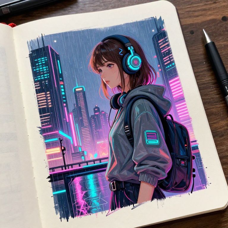 Brown hair girl drawing a futuristic cyberpunk city in neon colors, wearing headphones and casual futuristic attire, detailed architecture and glowing holographic elements on the sketchpad, moody night scene with rain reflections and electric energy
