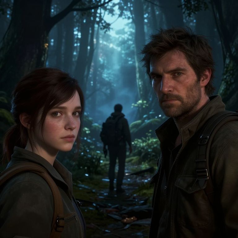 Head-And-Shoulders Shot ellie and joel from the game the last of us leaving the magical forest. 8k. uplight.,