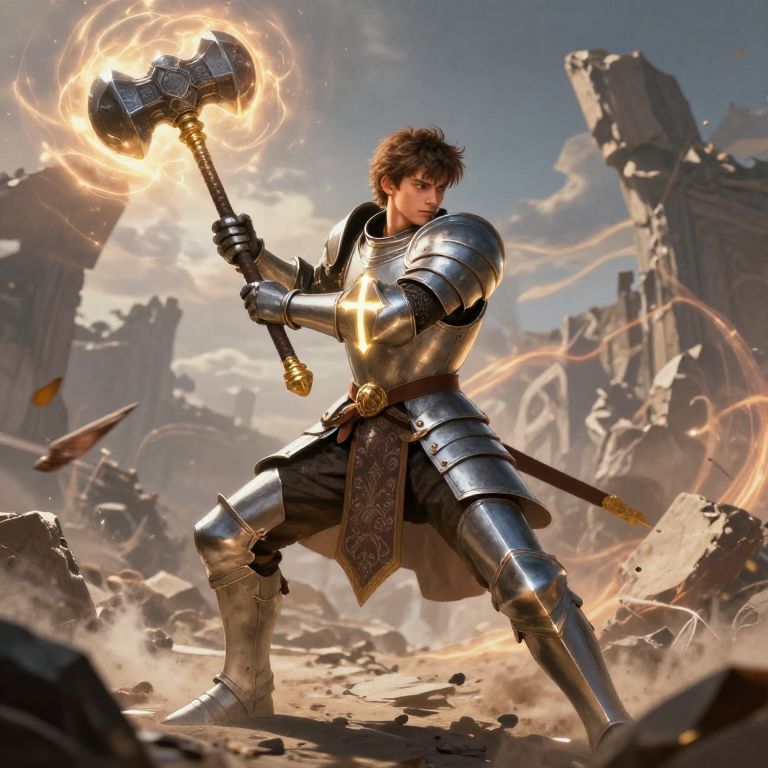 This digital artwork depicts a muscular, young male warrior with brown hair, clad in shiny, silver armor. He wields a glowing, fiery hammer in his right hand, with energy arcs surrounding it. His expression is determined, eyes focused forward. The background shows a ruined, rocky landscape with crumbling stone structures and a bright, clear sky. Dust and debris float in the air, adding to the chaotic atmosphere. The warrior's armor features intricate gold designs on the chest and waist, and a sword is sheathed at his back. The image has a dynamic, action-packed style with high contrast and detailed textures, emphasizing the heroic and epic nature of the scene.