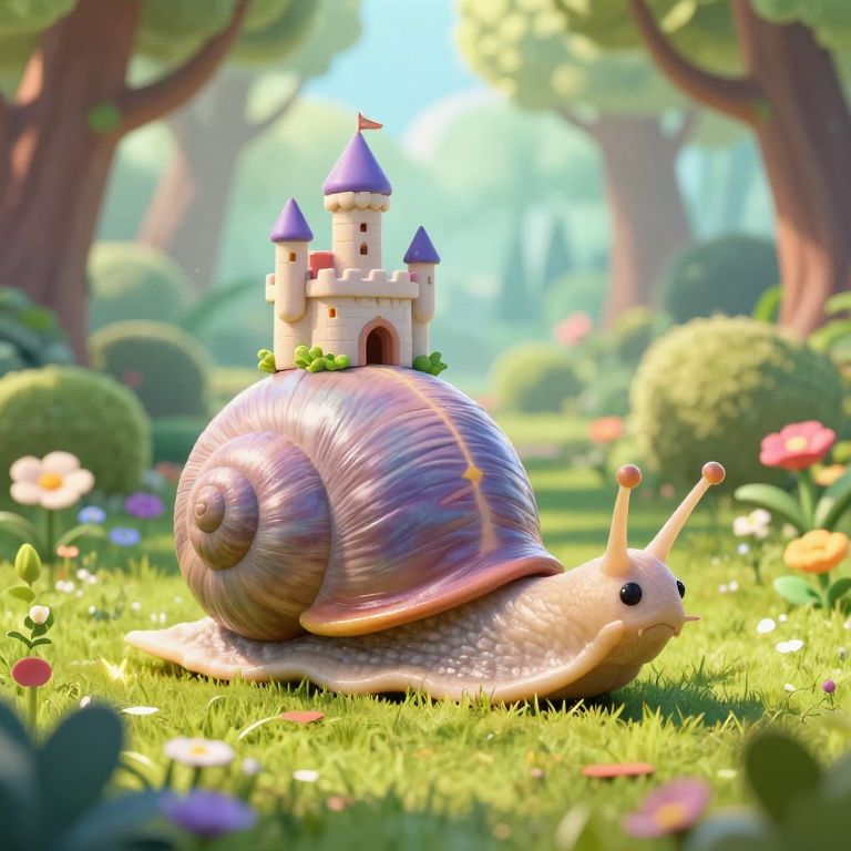 CGI image of a whimsical garden scene: a snail with a colorful, iridescent shell carries a tiny, blue-turreted castle