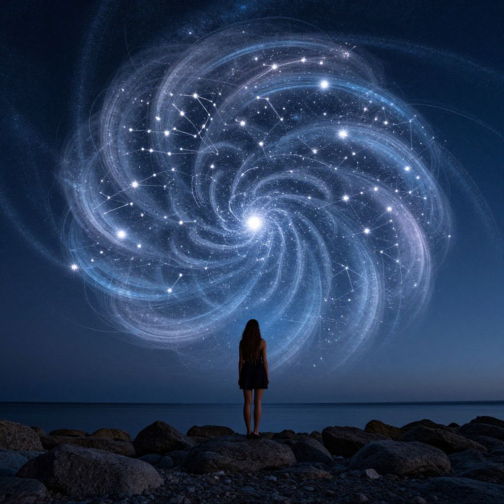 Silhouetted girl gazes at a glowing, swirling galaxy of blue and white stars over a calm ocean, surrounded by rocks. Digital art.