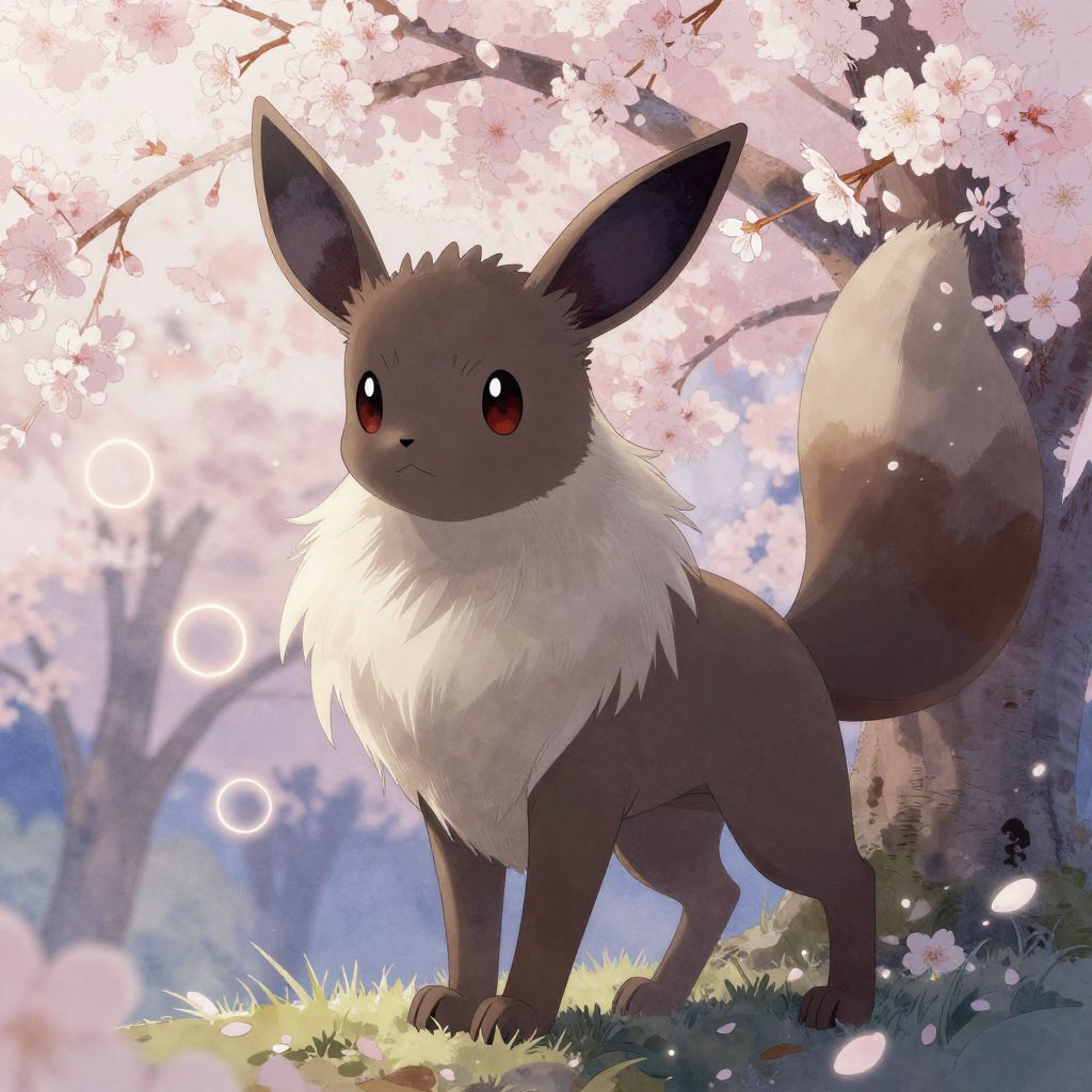 Digital anime-style drawing of an Eevee, a small, fox-like Pokémon with large ears, a bushy brown and cream-colored tail, and a fluffy cream-colored neck ruff. Eevee stands on a grassy patch under a cherry blossom tree, surrounded by pink blossoms and floating petals. The background features soft, blurred blue and purple hues, with sunlight filtering through the blossoms, creating a magical, dreamy atmosphere. Eevee's red eyes are wide and expressive, adding a sense of innocence and curiosity to the scene.