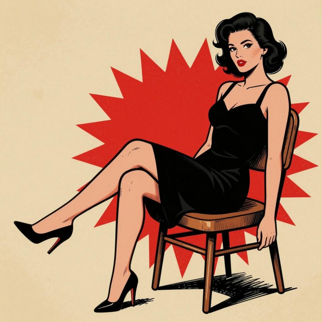 Woman sitting on a chair, wearing a black dress, legs crossed, relaxed pose, retro pop art style with sketchy and expressive lines, beige and red background with grunge texture, vintage comic book vibe, beige and red color scheme