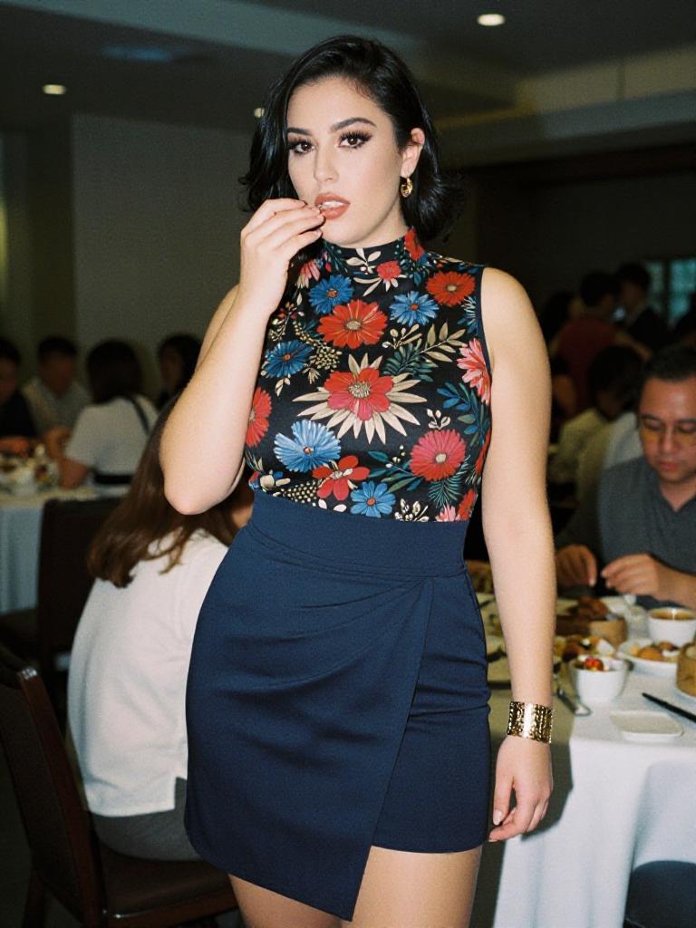 A lanky woman in trendy fashion, wearing a high neck sleeveless top with a floral pattern of red and blue flowers on a black background, paired with a fitted navy blue knee-length skirt in an asymmetrical wrap style, accessorized with a gold cuff bracelet, captured in the visual style of Eastman LLP film stock, enjoying a dim sum brunch in Singapore. Sexy. Pretty face and beаutiful eyes. Big breasts