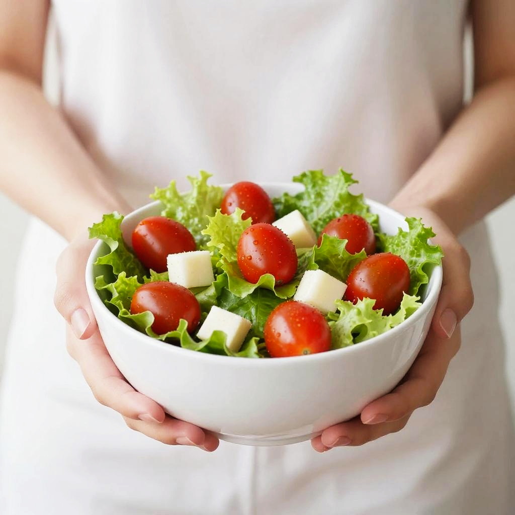 Photograph of a person's hands holding a white bowl filled with fresh salad. The salad has vibrant red cherry tomatoes, green lettuce, and a few pieces of cucumber. The person's arms are visible, wearing a white sleeveless top. The background is plain white, making the colorful salad pop. The image has a clean, bright, and healthy feel.