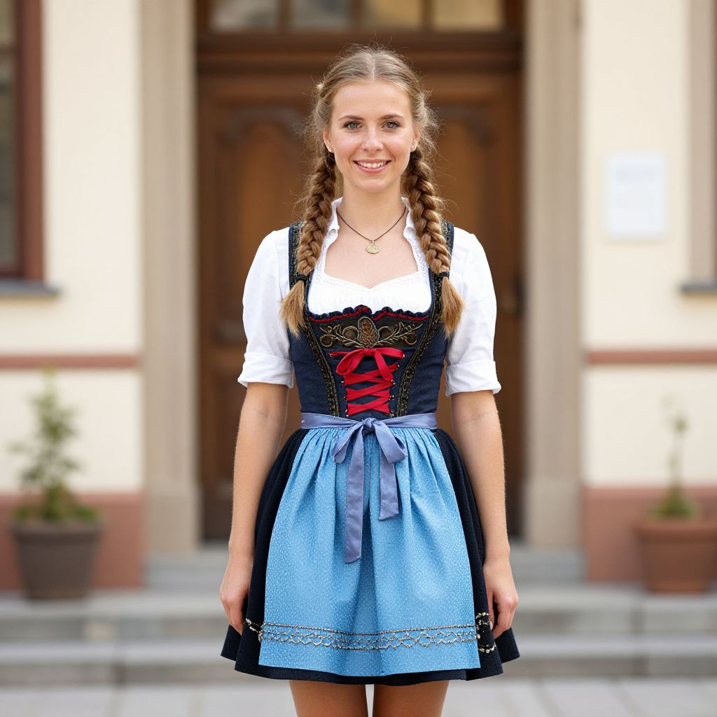 Traditional German Dress Oktoberfest Costume, woman in traditional bavarian dress standing in front of a building