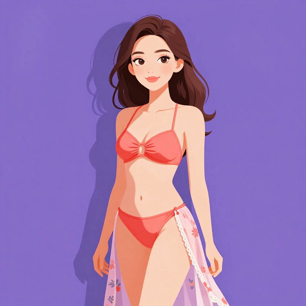 Woman with pretty face and pretty hair. Tankini set, vibrant coral color, soft nylon blend, adjustable straps, ruched detailing, high-waisted bikini bottom, matching beach dress, lightweight chiffon, flowy silhouette, floral print, delicate lace trim. --sref 1461