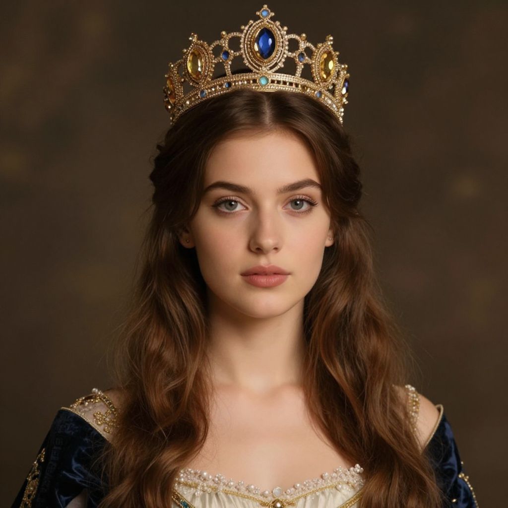 Photograph of a young Caucasian woman with fair skin and long, wavy brown hair, wearing a detailed gold crown adorned with blue and yellow gems. She has light blue eyes, subtle makeup, and a neutral expression. She is dressed in a dark blue velvet gown with gold-trimmed shoulders and a white, beaded neckline. The background is a dark, blurred gradient, highlighting her as the central focus. The lighting is soft, emphasizing her serene and regal appearance.