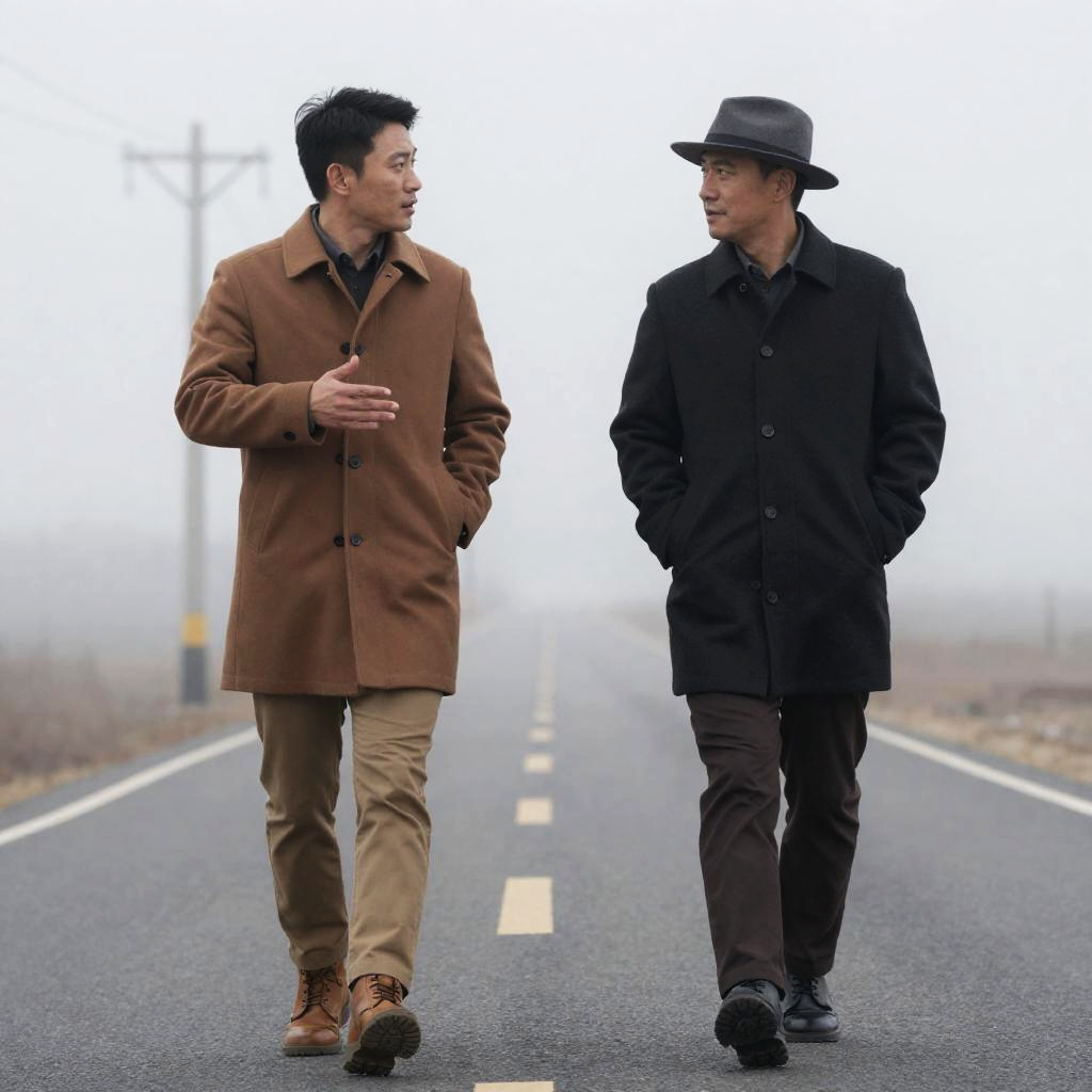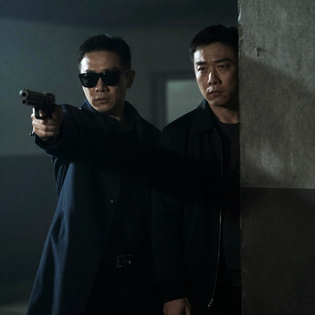 Two men in dark, worn tricorne hats and face masks with visible eyes. One on the left, the other on the right, both with intense expressions. Blue moonlit landscape in the background. Foreground focus on men's faces and hats.