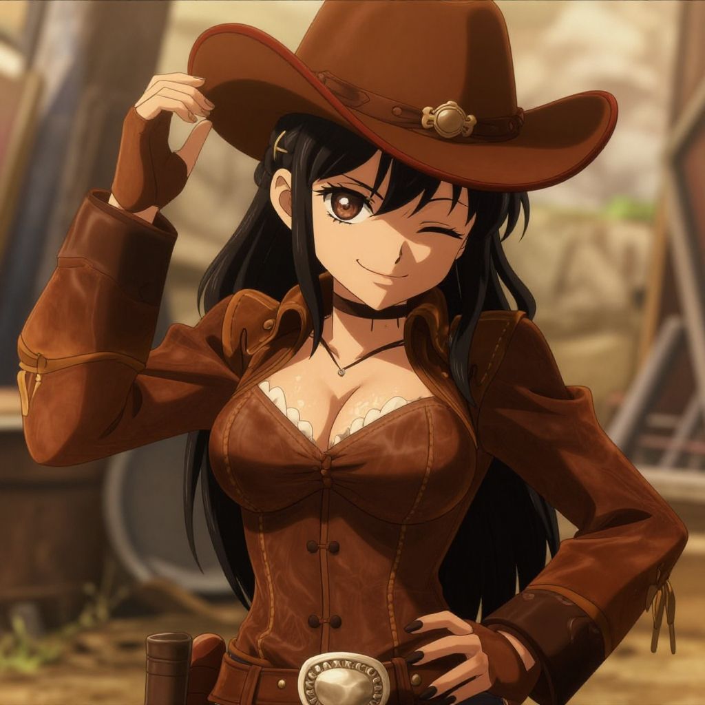 Anime-style digital illustration of a sexy black-haired woman in a brown cowboy outfit, winking, adjusting her hat, with a blurred western backdrop.