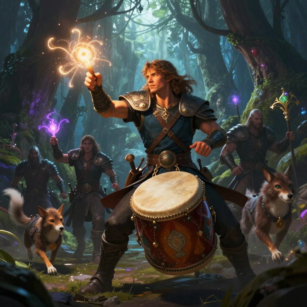 Male bard fantasy art, dynamic scene of a bard leading a group of adventurers through a dark enchanted forest, playing a magical drum that emits pulses of light, detailed armor and clothing, mystical animals following along, vibrant colors and dramatic fantasy lighting.