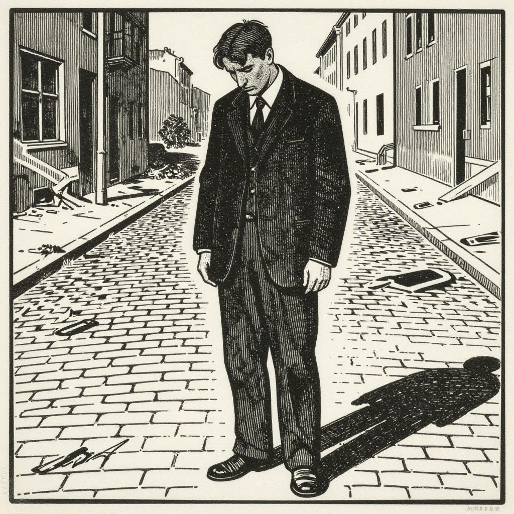 A detailed black and white woodblock print etching depicts a sad, depressed man in a business suit standing on a cobblestone street in an abandoned area of a city, evoking the style of Kathe Kollwitz.