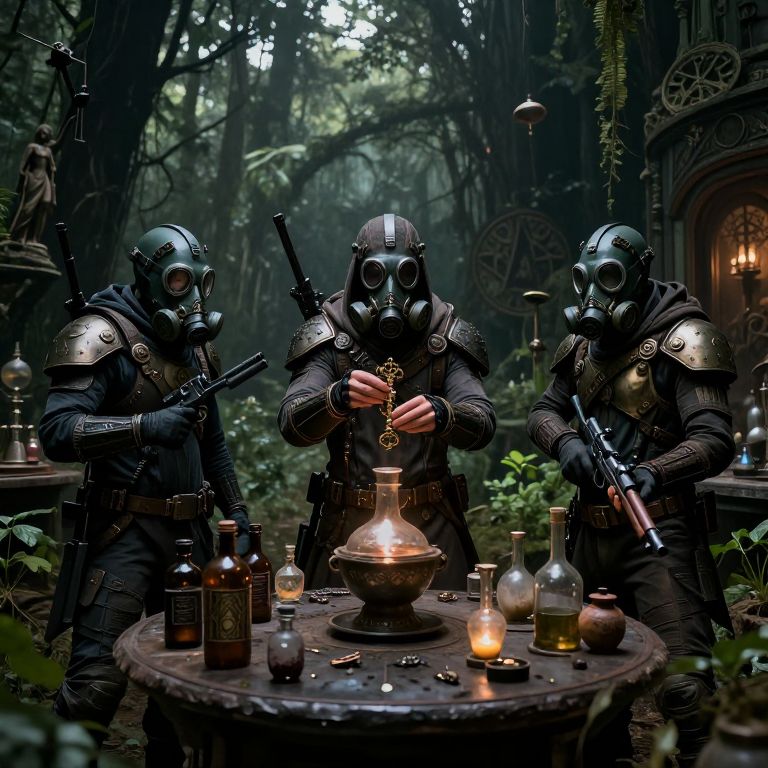 In a dimly lit, abandoned laboratory deep in a forest, three post-apocalyptic alchemists are engrossed in their religious potion-making ritual. The room is cluttered with various bottles, vials, and plants, suggesting a complex alchemical process. The alchemists, dressed in futuristic tactical gear, wear gas masks with intricate designs, hinting at a post-apocalyptic setting. One alchemist, positioned centrally, is holding a small, ornate object, possibly a key or a relic, while the others stand guard with guns, emphasizing the protective nature of their ritual. The room is adorned with occult symbols and statues, adding to the mystical atmosphere. The overall composition is chaotic yet harmonious, with the alchemists and their equipment arranged in a semi-circle around the central figure, creating a sense of unity and purpose. The interplay of dark, muted colors and the metallic sheen of their gear and masks creates a striking contrast, enhancing the sense of a world on the brink of collapse yet still clinging to ancient rituals and knowledge.