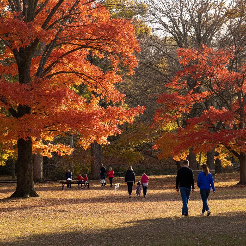 A lush park in Peabody during early fall, trees with fiery red and orange leaves, people walking dogs and children playing, sun rays filtering through branches, detailed foliage, vibrant natural colors, photo-realistic.