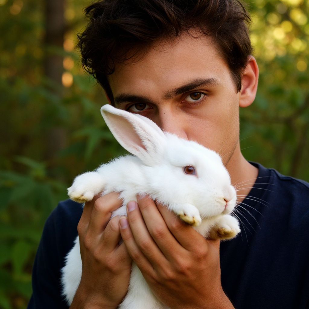 Intimate portrait of a gentle soul, hands cradling a soft white bunny, set against a serene backdrop of lush greenery, warm sunlight filtering through the trees, capturing the quiet moments of connection between man and nature, rich textures, vivid colors, high-resolution clarity. Man has masculine face and piercing eyes