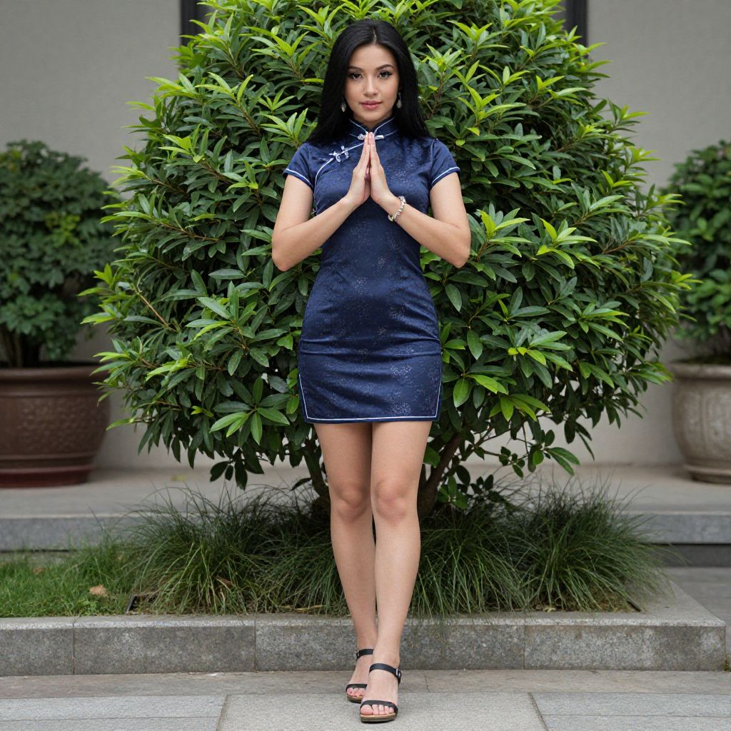 Photograph of an Asian woman with long black hair, wearing a short navy blue cheongsam, standing in front of a lush green bush, hands