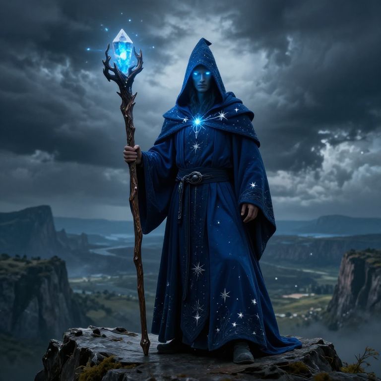 Digital artwork of a blue-robed, hooded wizard with glowing blue eyes and staff, standing on a rocky cliff under a stormy sky.