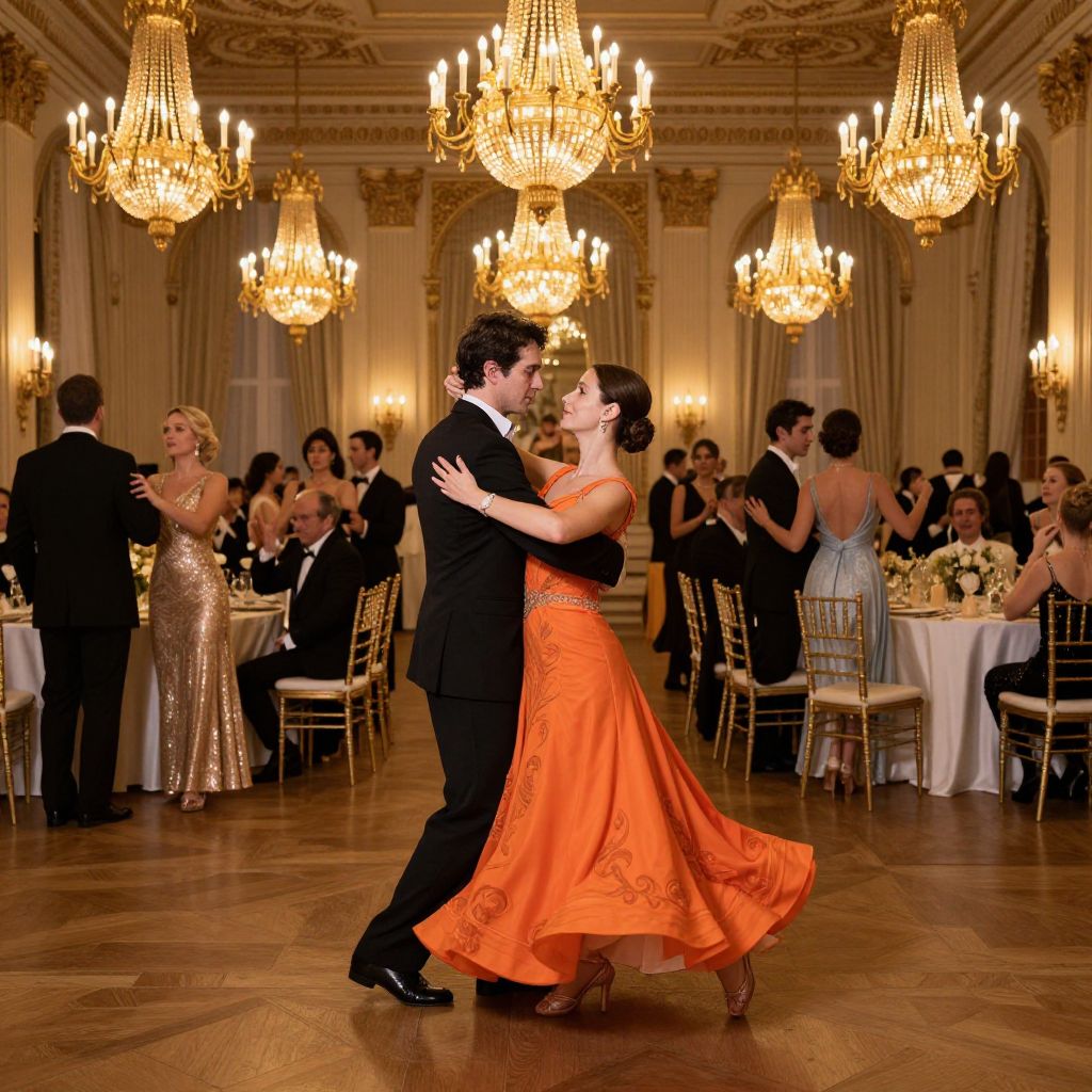 Photograph of a romantic ballroom dance, man in black suit, woman in vibrant orange dress, surrounded by elegant chandeliers and well-dressed