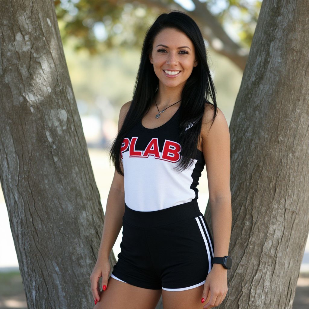 Photograph of a smiling woman with long black hair standing between two tree trunks. She's wearing a black and white sleeveless top with "PLAB" in red, and black high-waisted shorts with white stripes. She has a black wristwatch on her left wrist and red nail polish. The background is a blurred, sunny outdoor setting with green foliage.