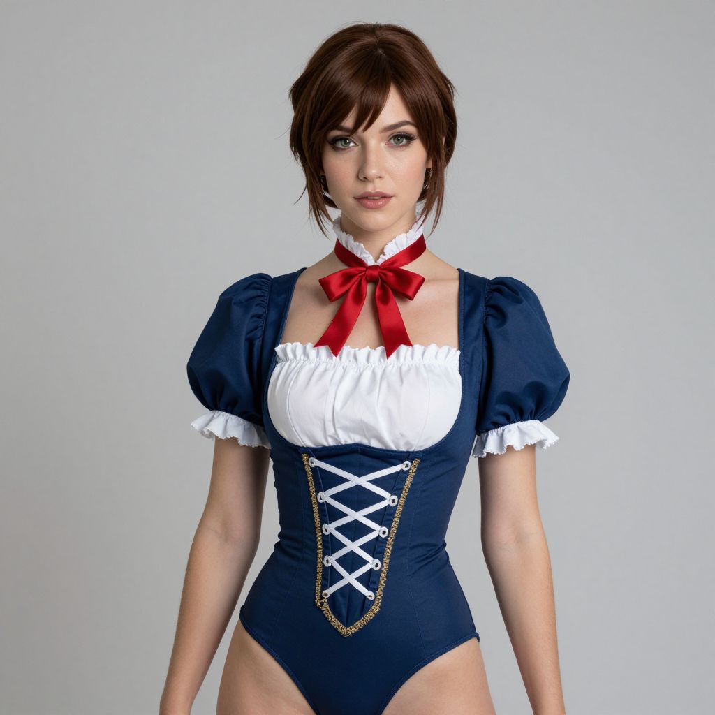 Sexy cosplay woman character wearing Beatrice costume. Realistic photo. Jane Doe dressed as Beatrice. Realistic photo, caucasian woman, pretty face
