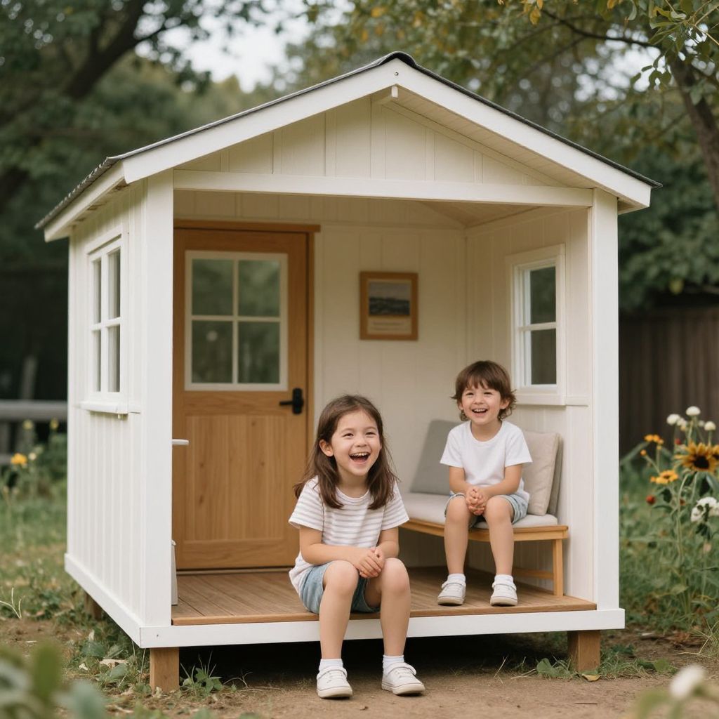 Photograph of two smiling children, a girl and a boy, sitting in a white wooden playhouse with a wooden door, surrounded by a lush garden