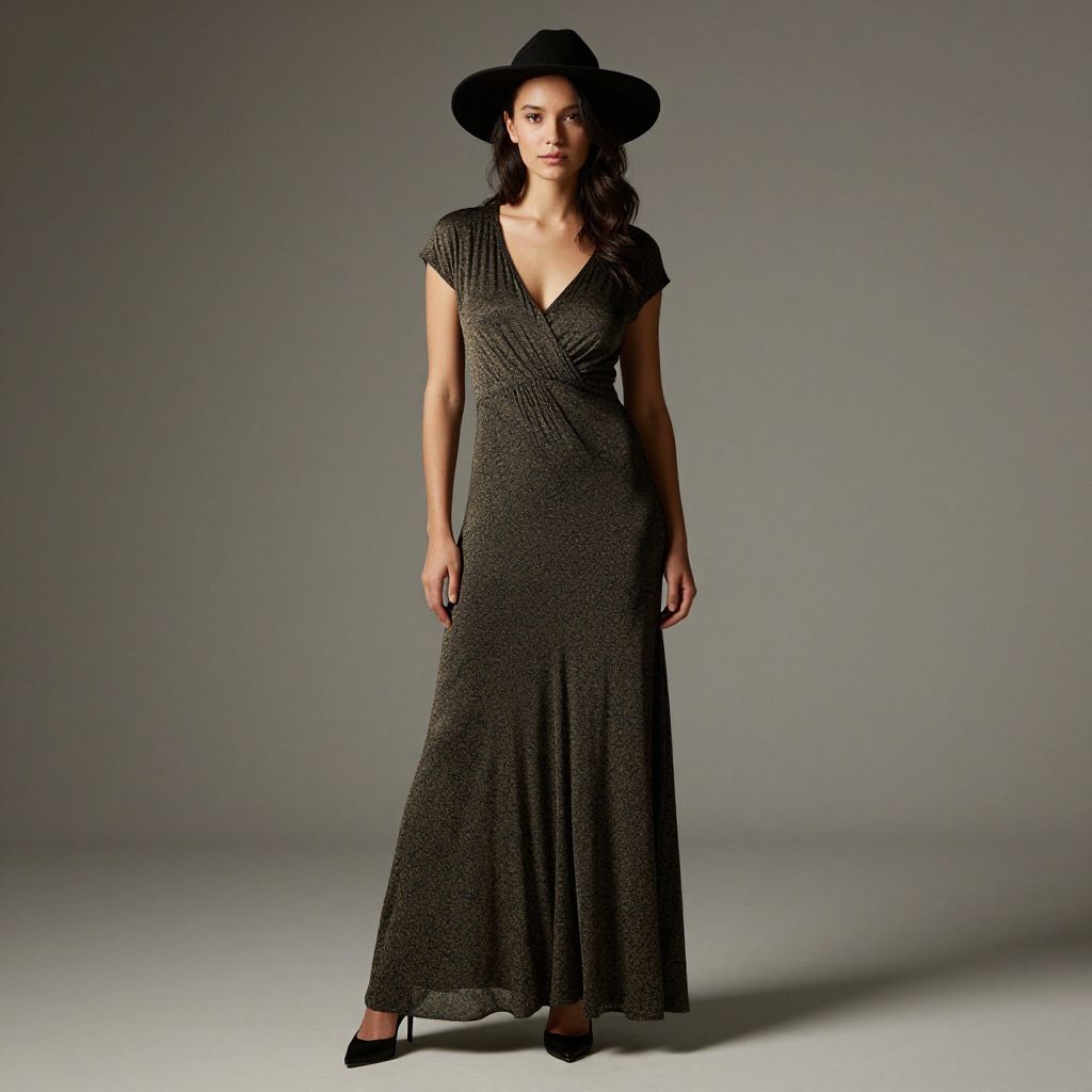 Photograph of a confident woman with long, wavy brown hair standing against a plain gray background. She wears a black V-neck dress with a fringed hem, a silver and black patterned shawl, and black ankle boots. Her accessories include multiple layered necklaces with turquoise pendants. She stands with her hands on her hips, exuding a bold and stylish presence. The lighting is even, highlighting the textures of her outfit and the metallic sheen of her jewelry. The overall style is modern and chic.