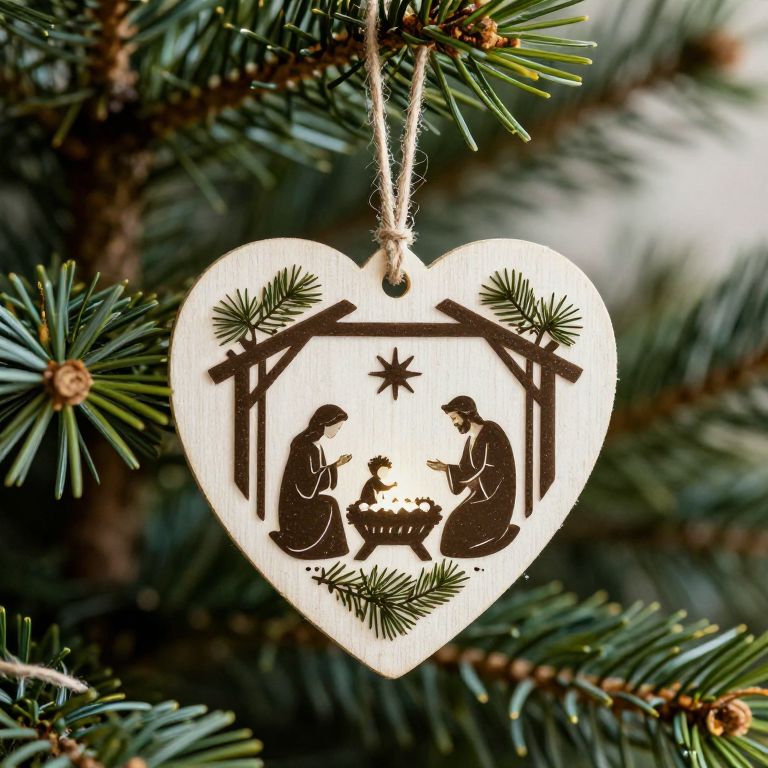 Heart-shaped ornament hangs gracefully from a pine tree branch, featuring a silhouette of the Nativity scene with Mary, Joseph, and baby Jesus in a manger, surrounded by a star-topped stable and adorned with natural twine and festive pine needles.