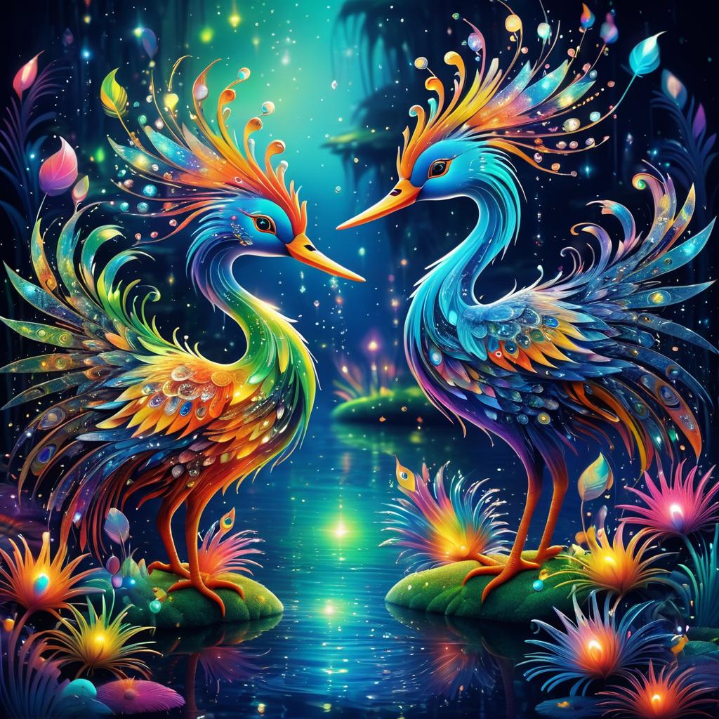 Intricately designed vibrant digital artwork featuring fantastical birds with shimmering feathers and bright beaks. The scene is set around a sparkling lake with lush, glowing foliage in a murky, colorful environment. Playful, cute creatures flutter and interact in a magical, illuminated natural landscape, showcasing a surreal blend of bright blues, greens, oranges, and purples.
