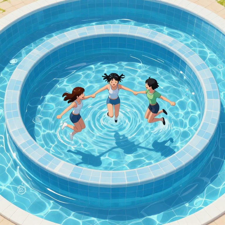 Three children with wet hair, wearing swimsuits, jumping joyfully into a circular, blue-tiled swimming pool, viewed from above. Digital anime-style