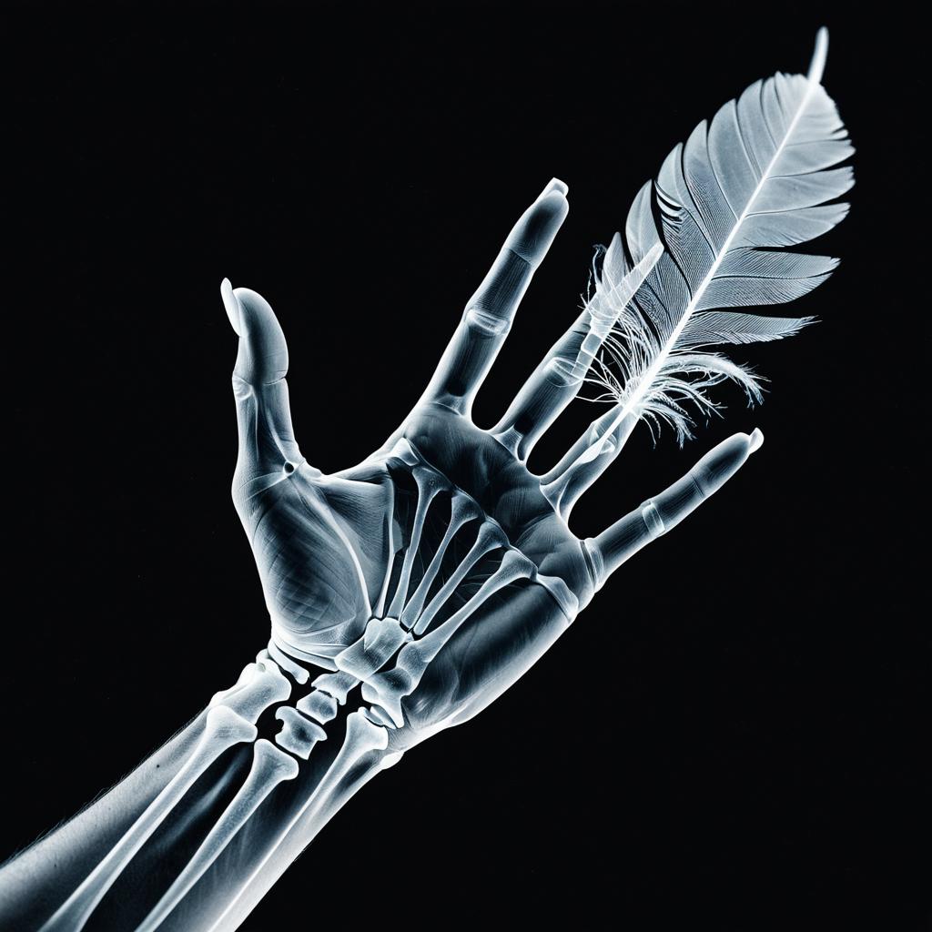 X-Ray artwork of a human hand holding a feather, bones and filaments glowing softly, intricate vein-like patterns, high contrast with glowing highlights and delicate textures