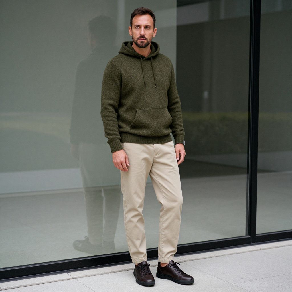 A man, olive green pullover hoodie, beige tapered jogger pants, dark brown leather sneakers, cozy texture, earthy tones, modern architecture, minimalist interior, large glass facade, 3M analog film stock, relaxed expression, thoughtful gaze. Man has masculine face and piercing eyes