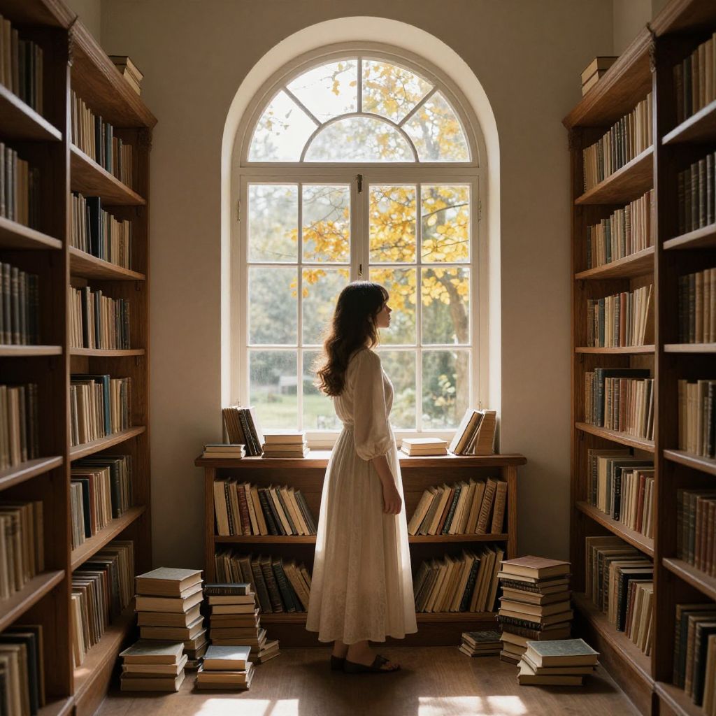 Sunlight streams through an arched window, illuminating a serene library scene where a woman in a flowing dress stands contemplatively, surrounded by scattered books and wooden shelves filled with ancient volumes, as nature's golden foliage frames the tranquil view beyond.