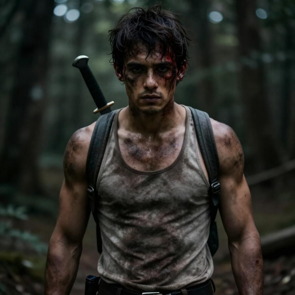 Photograph of a muscular, shirtless man with dark, messy hair, bound to wooden beams with ropes. His face is contorted in a scream, mouth open wide, eyes closed. His skin is glistening with sweat, and he has a black strap across his chest. The background is dark and blurry, emphasizing his distressed expression and physical struggle.