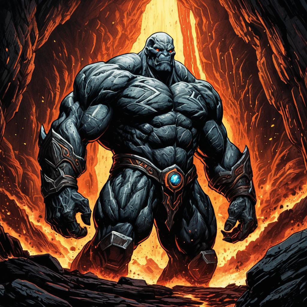 A towering golem made of dark rock with textured bristled fur stands with a fierce and powerful stance amidst a volcanic landscape with flowing molten lava and thick smoke. The golem's muscular body features spikes and rugged detailing, with glowing red eyes that emphasize its fury and strength.