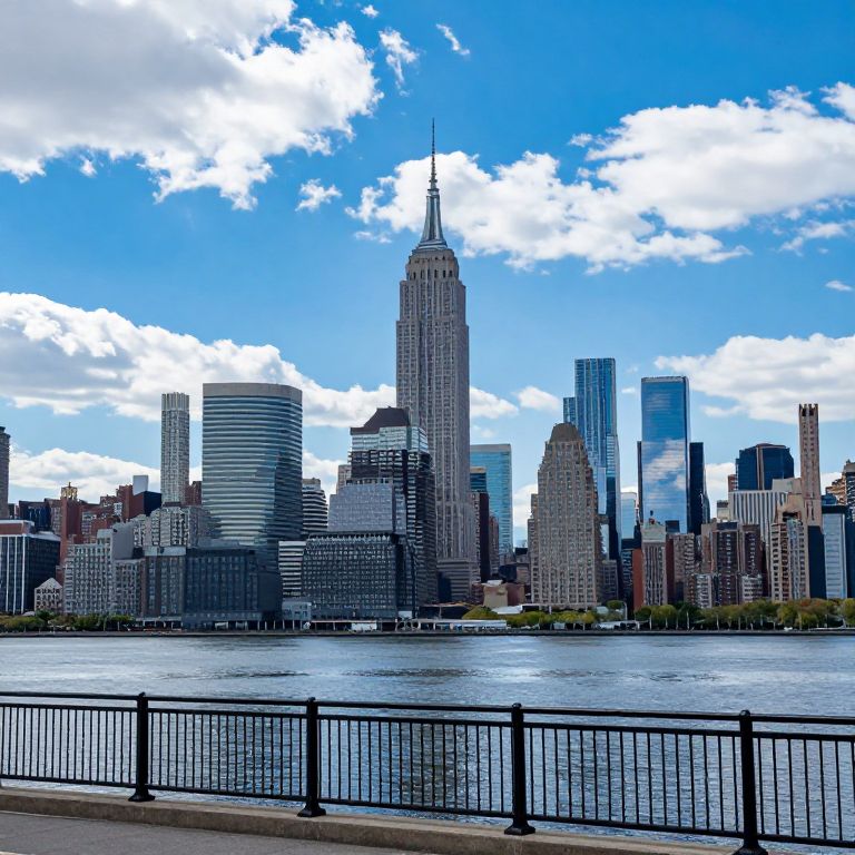 Photograph of a vibrant New York City skyline under a bright blue sky with scattered white clouds. The Empire State Building stands tall in the center, surrounded by various skyscrapers. A black metal fence runs along a concrete waterfront in the foreground. The water reflects the buildings, adding a shimmering effect. The overall scene feels crisp and urban.