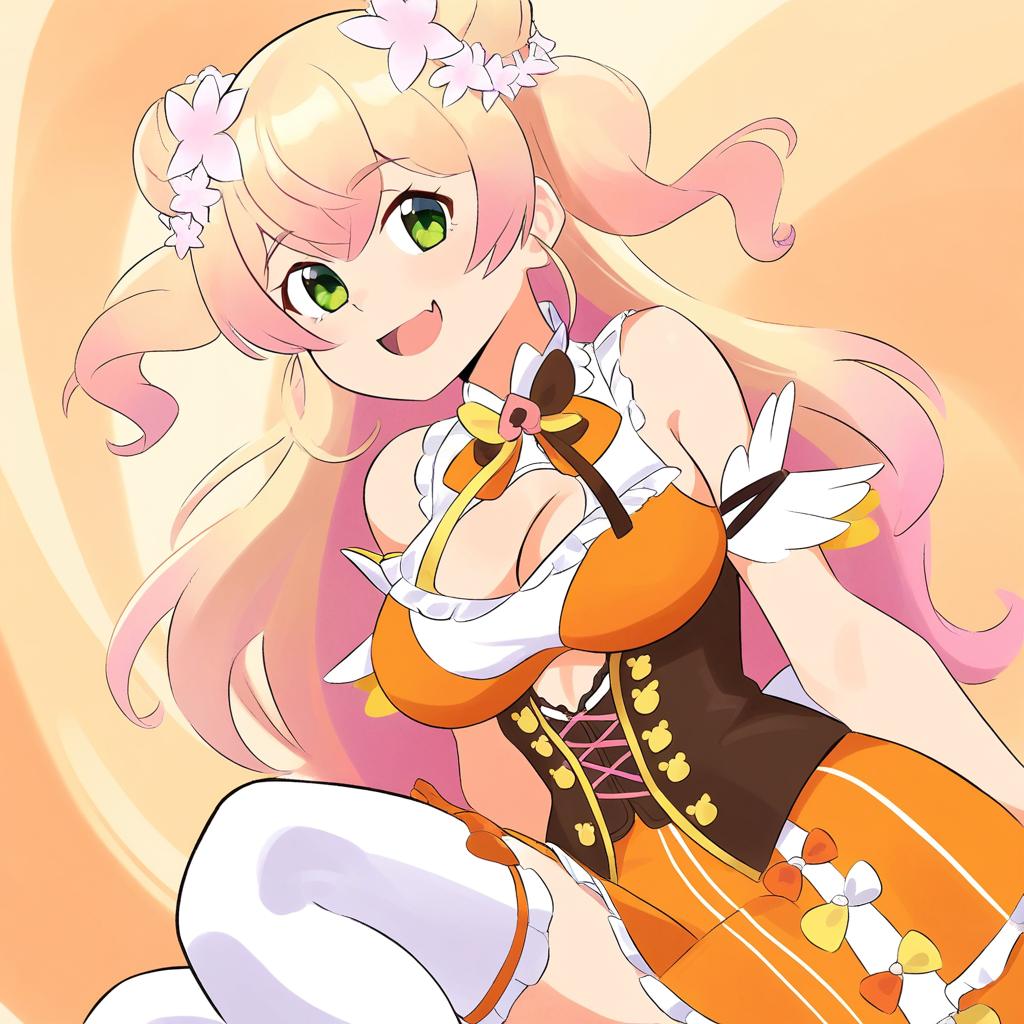 Momosuzu nene (1st costume), hololive, 1girl, fang, green eyes, hair between eyes, blonde hair, long hair, gradient hair, pink hair, two side up, double bun, hair flower, large breasts, medium breasts, cleavage, cleavage cutout, cutout above navel, frilled shirt, orange shirt, orange skirt, frilled skirt, sleeveless shirt, multicolored bow, brown bowtie, orange bowtie, yellow bowtie, multicolored bowtie, bare shoulders, virtual youtuber, virtual youtuber, underbust, corset, by artist squeezable (squeezabledraws), leet