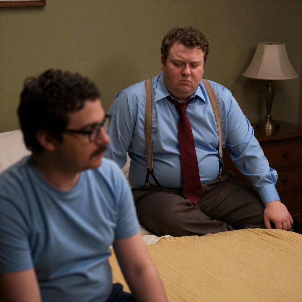 Two men in a dimly lit room. The man on the left, overweight with curly dark hair, wears a light gray shirt and dark suspenders, leaning forward with a concerned expression. The man on the right, slim with short dark hair and sunglasses, wears a striped shirt and sits with a relaxed posture. A lamp is in the background.