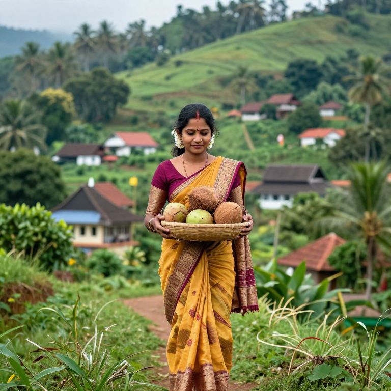 A lively outdoor marketplace in a tropical rainforest village, where vendors sell handwoven baskets, tropical fruit, and herbal teas, a teenage girl with dark brown skin and bright green eyes wearing a colorful woven dress is examining a basket of mangoes, under a canopy of large trees with green leaves and a clear river in the distance, warm golden light filtering through the foliage.