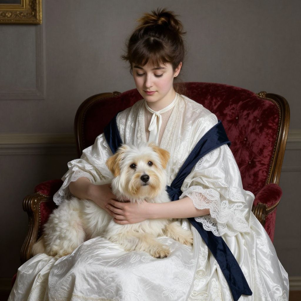 Elegant portrait featuring a woman seated on a red velvet chair, dressed in an ornate white gown with lace detailing and a navy sash, gently cradling a fluffy white dog with golden highlights, evoking the style of Madame Renoir's 19th-century portraiture.