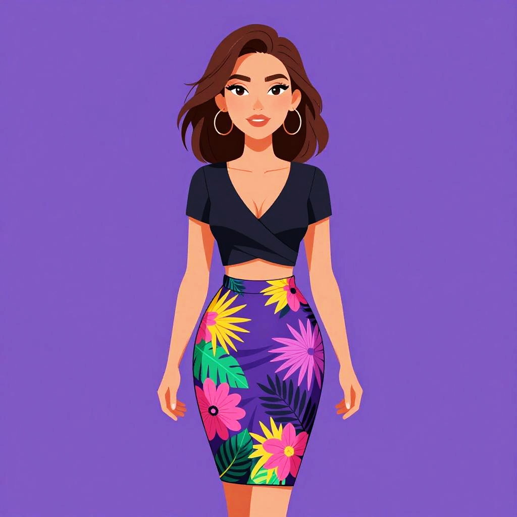Woman with pretty face and pretty hair. Woman, chic, black crisscross crop top with a v-neckline, short sleeves, paired with a high-waisted pencil skirt featuring a vibrant tropical print with floral and foliage patterns in pink, purple, green, and yellow, knee-length. --sref 1467