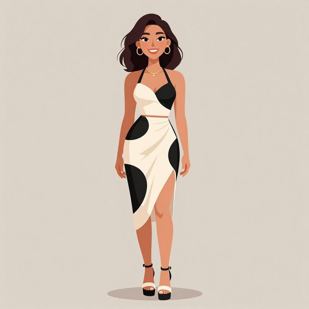 Digital illustration of a smiling woman with medium-length black hair, wearing a short, form-fitting brown dress, gold hoop earrings, and a leaf-shaped