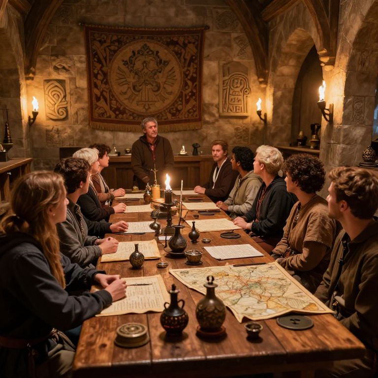 Photograph of a medieval-style meeting in a dimly lit, stone-walled room with arched ceilings. Eleven people, dressed in medieval and historical attire, are seated around a wooden table with candles, maps, and writing utensils. A middle-aged man with short gray hair stands at the head, addressing the group. The background features ornate tapestries and wall sconces with lit candles. The attendees have varying hair colors and styles, with both men and women present. The atmosphere is warm and focused, evoking a sense of historical intrigue.