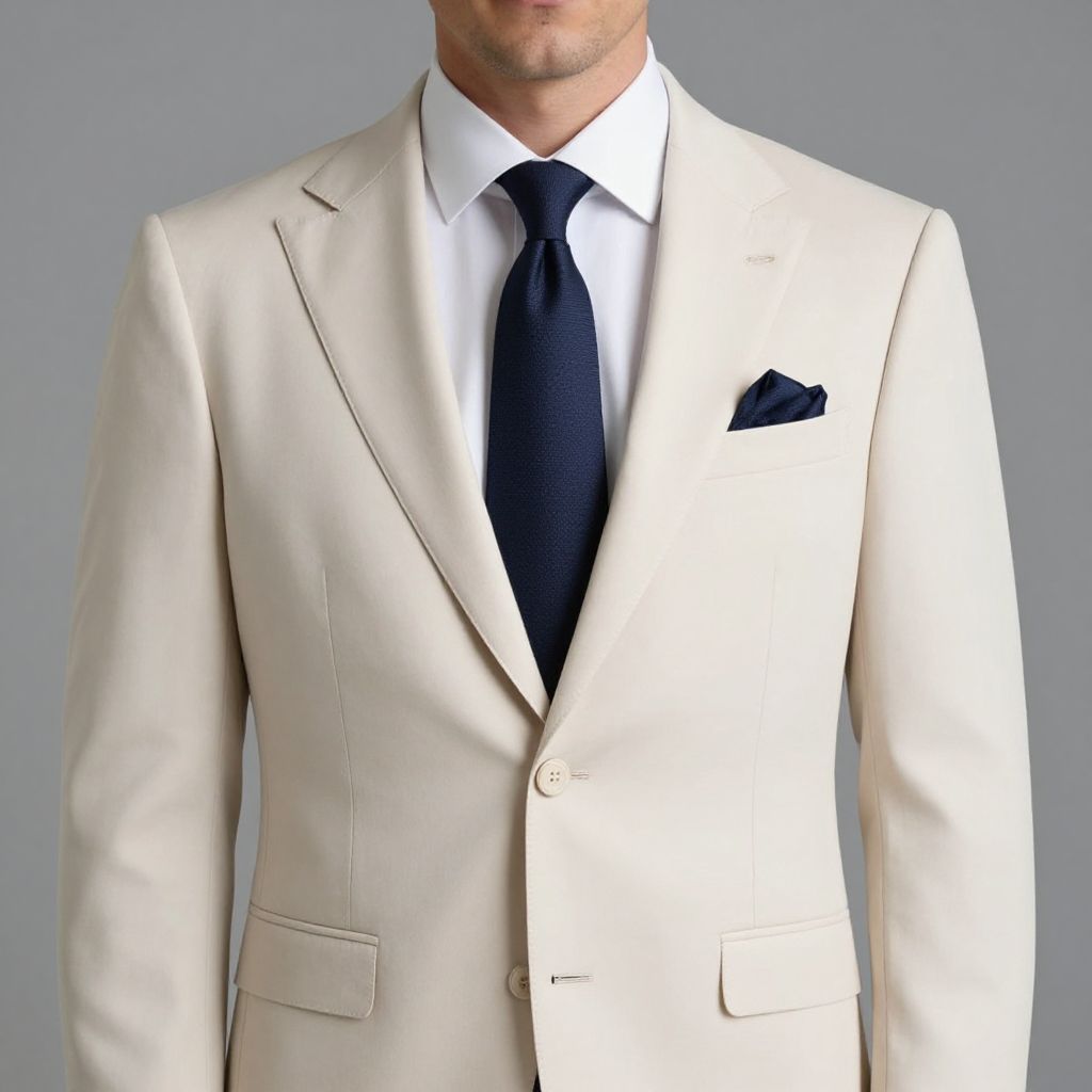 Elegantly styled man wearing a cream-colored suit paired with a crisp white shirt, navy tie, and matching pocket square, exuding sophistication against a neutral gray backdrop.