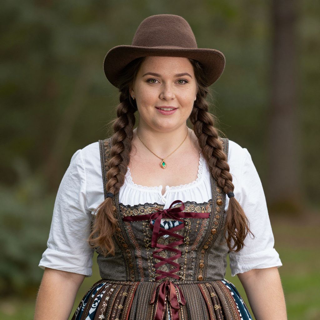 Photograph of a fair-skinned woman with long brown hair in two braids, wearing a brown felt hat, white short-sleeved blouse, and a dark brown corset dress with intricate lace and red lacing. She has a green pendant necklace and smiles gently. The background is a blurred, green forest setting. The corset's pattern includes small, colorful designs, and the dress has a full, ruffled skirt. The overall style is reminiscent of traditional European folk attire.