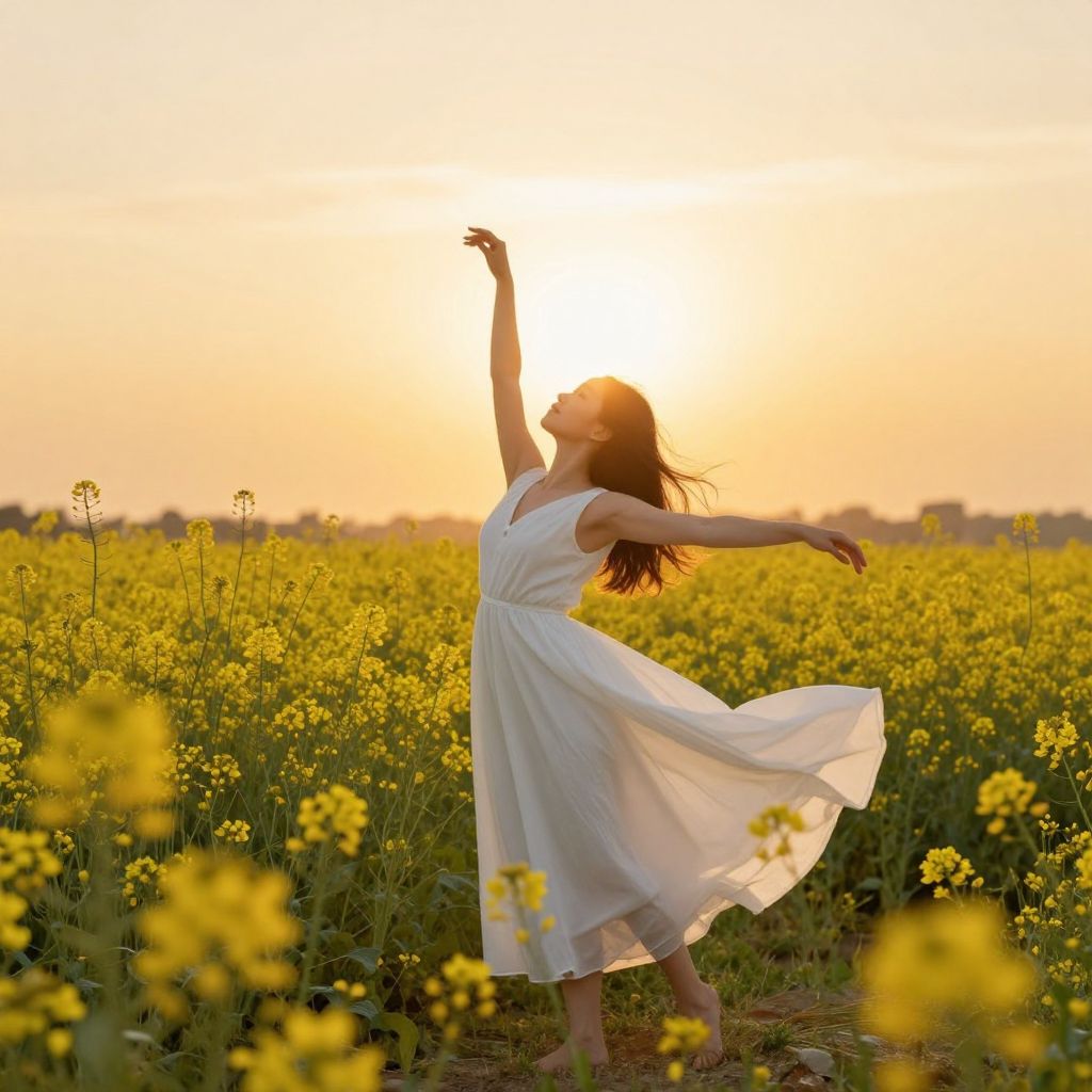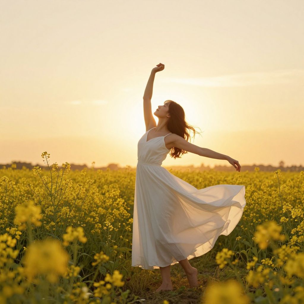 A serene digital artwork captures a woman in a flowing white dress dancing amidst a field of vibrant yellow flowers under the radiant glow of a golden hour sunset, evoking a sense of freedom and harmony with nature, reminiscent of Joh Kagaya's ethereal style.
