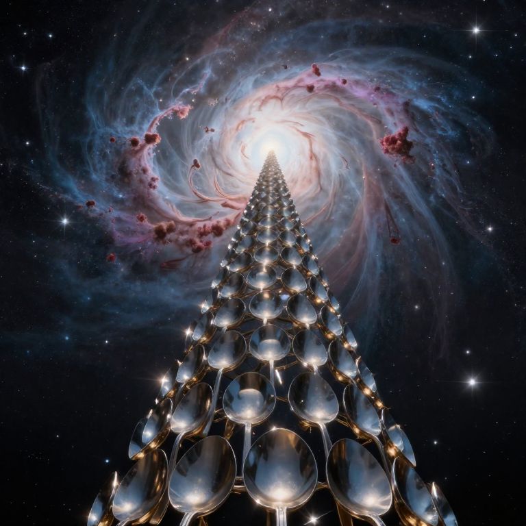 A towering spiral of polished spoons ascends into the cosmic expanse, defying gravity as it stretches toward a radiant nebula, its curves catching the light like a celestial beacon.