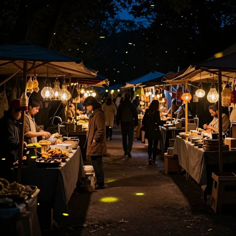 Photograph of a nighttime market stall with glowing string lights, woman with curly hair browsing bottles, blurred crowd in background.